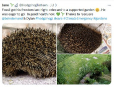 'Dylan, Delilah, Norman & Nora' - In early Summer I was called out to a local farm where a nest had been disturbed containing 4 tiny hoglets. Following advice from the rescue centre, we waiting to see if Mum would return, but sadly she didn't, so early in the morning before school I rescued them and took them to the centre. They were tiny - just a few days old, eyes still closed, and needed intensive care. Sadly, Nora passed away after a short time, but the other three (Dylan, Delilah and Norman) are thriving thanks to the incredible 24/7 care given from the centre. All three grew up to a great size and are thriving in their supported garden!